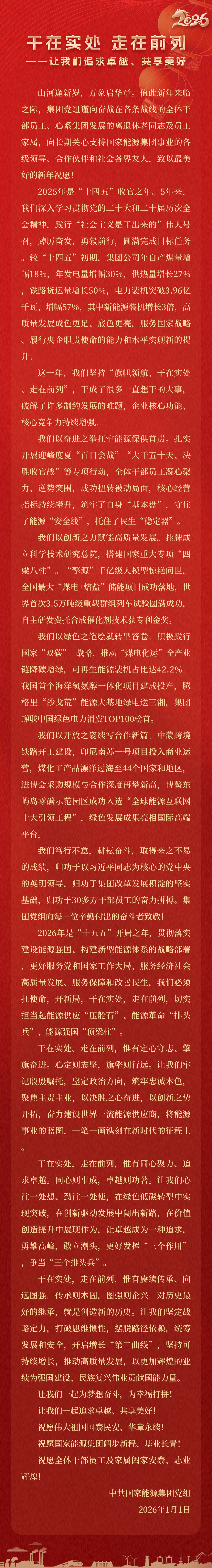 國家能源集團胸懷“國之大者”,增產增供、穩價穩市,積極服從服務國家戰略、保障國家能源安全、助力國民經濟穩增長,推動煤炭安全綠色智能、煤電清潔高效穩定、現代煤化工高端多元低碳、運輸物流協同一體、新能源多元創新規?;l展,全力擔當能源強國頂梁柱,能源供應壓艙石,能源革命排頭兵。